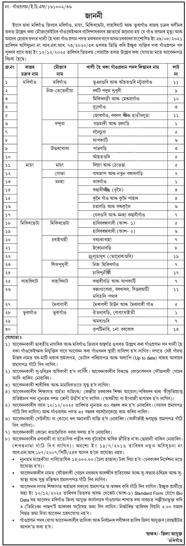 The District Commissioner, Morigaon has released an official notification for the recruitment of 30 Gaon Pradhan posts under various revenue circles including Morigaon, Mayong, Mikirbheta, Lahorighat, and Bhuragaon.